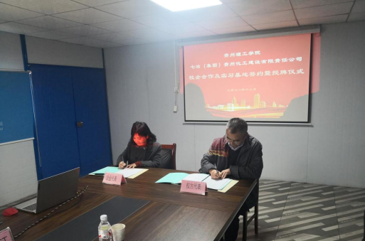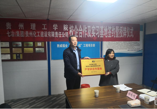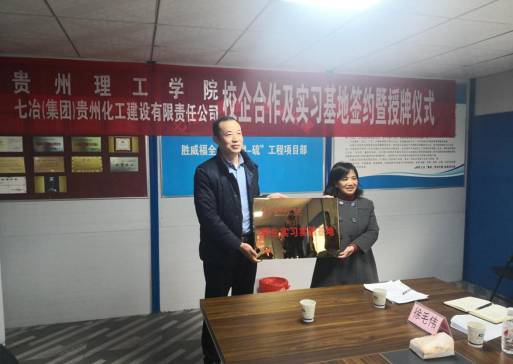 会上,陈丽琪介绍了贵州化工建设有限责任公司福泉分公司的现状,莫立坡、唐安江分别就贵州理工学院及化学工程学院的基本情况进行了介绍。针对生产中存在的具体问题,化建所属部门负责人提出相关需求,并与教师们进行技术探讨和交流,在科研、成果转化及人才培养等方面达成共识。最终,双方签订了校企合作协议及实习基地建设协议,并举行了的签约及授牌仪式。