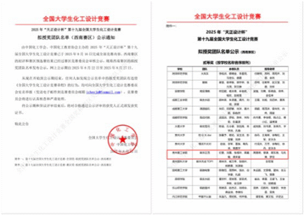 近日,由中国化工学会和中国化工教育协会主办的2025年“天正设计杯”第十九届全国大学生化工设计竞赛已于2025年8月16日完成全部竞赛内容。我校化学工程学院2022级本科生纪曼、刘露、张福玲、蒋義璧、龚来富组成的“砜华正茂”团队在周理明、曾谦、蒋东海等老师的指导下凭借出色的设计方案和扎实的专业功底经过省赛和赛区选拔最终荣获全国二等奖。