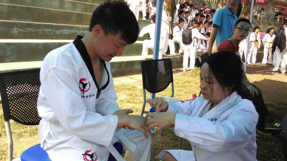 运动会在竞争紧张激烈的氛围中持续了三天,医务室的医生们也在场外守候了三天。虽然“救死扶伤”是这群白衣天使的天职,但是她们却不希望有任何一名运动员受伤。当出现受伤学生的时候,她们会迅速的取出消毒棉签、棉球、消毒酒精及纱布等医疗工具为受伤学生提供医疗帮助,在这赛场上她们不仅是运动员们的“定心丸”,更是又一道亮丽的风景线。