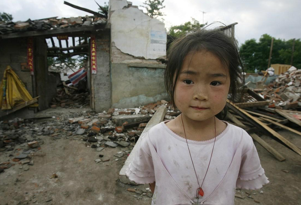 图为2008年5月14日,四川省绵阳市安县朝阳村7岁的李洋洋和她的小狗花花站在倒塌的房前。