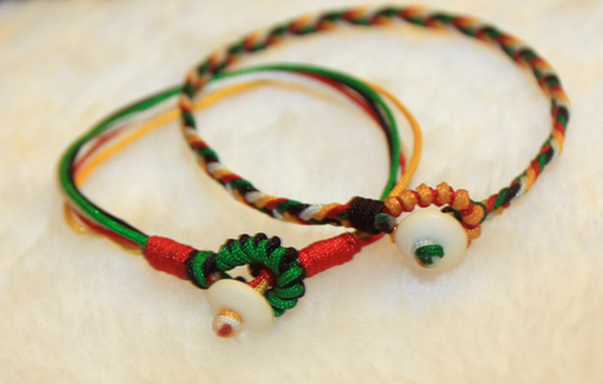 应劭的《风俗通》则记载:“五月五,日以五彩丝系臂,名长命缕,一名续命缕,一命辟兵缯,一名五色缕,一名朱索,辟兵及鬼,命人不病瘟”。五彩丝不是五彩缤纷的花色丝线,而是确定了的红、黄、蓝、白、黑五种颜色的丝线合并成的缕索。