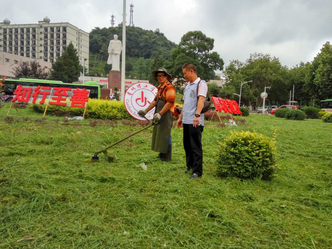 都说校园环境是一所学校名片的底色,那么理工名片的底色必定是干净明朗、柔和细腻的。为了顺利迎接我校第一届校园开放日的到来,校园管理科的老师们每天都对校园进行仔细巡查,清理枯枝、危枝,查看花苗的成长情况,跟着工人一起修剪草坪,清运垃圾。也许你并不认识他们,但他们的努力,你一定看到了。看吧,绿树成荫,每一棵校树都有它自己的“名片”;看吧,花团锦簇,莲叶、莲花镶嵌于池塘里;看吧,校园里道路干净整洁,每一处垃圾点都清运及时不堆积......
