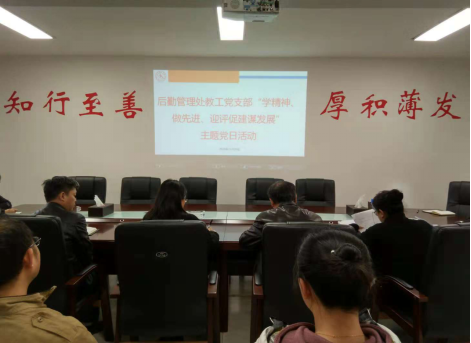 11月20日中午12:00,后勤管理处教工党支部开展“学精神、做先进、迎评促建谋发展”主题党日活动,会议由党支部书记主持,处级领导干部以普通党员的身份参加了主题党日活动,党支部还邀请了党外群众参加了会议。