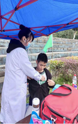 在运动场上,身着白衣的她们随时关注着赛场上运动员的身体状态,询问病情,监测生命体征,为受伤者清创、消毒,为肌肉痉挛者按摩放松,为晕厥学生放松心情,为出现各种不适的患者检查身体。由于近期贵阳天气变化大,早晚温差明显,易发生中暑、受凉感冒等身体不适情况,我校医护人员随时注意场上运动员及在场观众的身体情况,不仅用精湛的医术缓解运动员的伤痛,更以热情的服务温暖运动员的心,为运动会的顺利举行保驾护航。