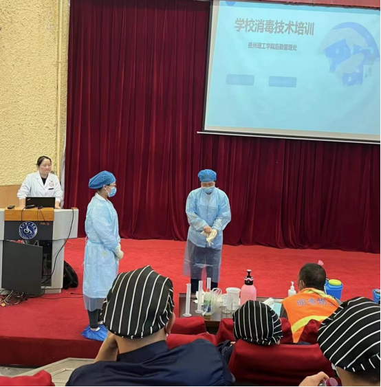 卫生所医务人员围绕校内环境消毒、快递场所消毒、消毒各环节注意事项以及消毒一线工作人员最为关注的消毒液配比、防护服穿脱人员着装等事项进行了深入浅出的讲解和现场实操示范,并对消毒液的配制进行了实际操作演练。
