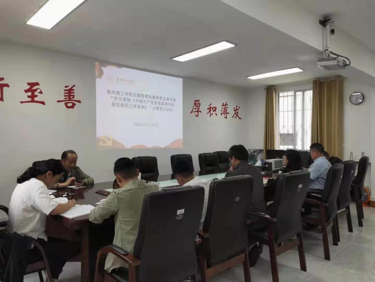 本网讯(后勤管理处 邵茜/文 )2021年5月31日下午14:30,后勤管理处教师党支部在后勤楼301会议室开展了“学习贯彻《中国共产党普通高等学校基层组织工作条例》”主题党日活动。
