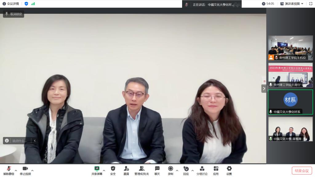 据悉,此次“黔台化工人才培养云交流促发展”对台教育交流项目以化工线上观摩交流课、学术主题研讨会的方式进行,项目自2023年11月13日启动,11月17日结束,为期5天。中国文化大学174名学生参加培训。培训课程经我校化学工程学院精心设计,即有化工原理、无机化学、化学反应工程等我校特色课程,也有普通化学、仪器分析、有机化学等台方优势课程。通过此次课程设计,让双方青年教师和学生全面、真实、深入地了解两岸化工学科与化工教育发展情况,了解黔台化工产业发展现状和化工类人才的需求,加强两岸优秀青年的学术文化交流,促进地方经济社会发展与两岸友好交往。