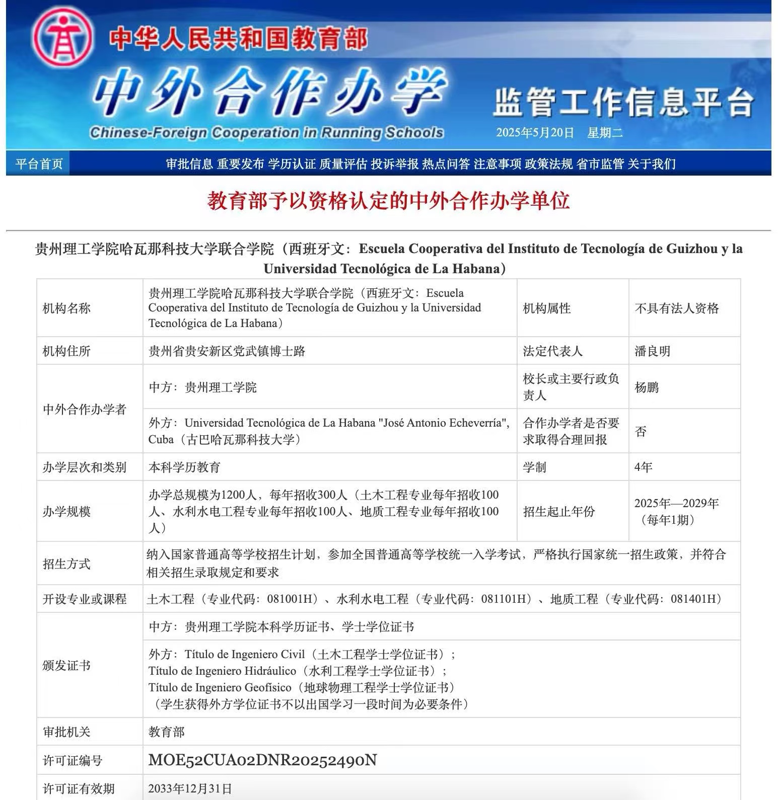 近日,教育部中外合作办学监管工作信息平台传来重磅喜讯:贵州理工学院与古巴哈瓦那科技大学合作设立的贵州理工学院哈瓦那科技大学联合学院正式通过教育部资格认定,成为学校首个获教育部批准成立的中外合作办学机构,是中拉首批工程类合作办学机构,也是全国为数不多用西班牙语授课的工程类中外合作办学机构,为中拉文明互鉴与科技教育融合开辟了全新路径。