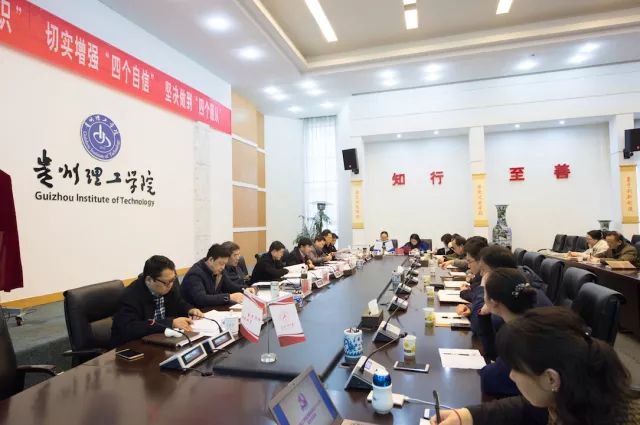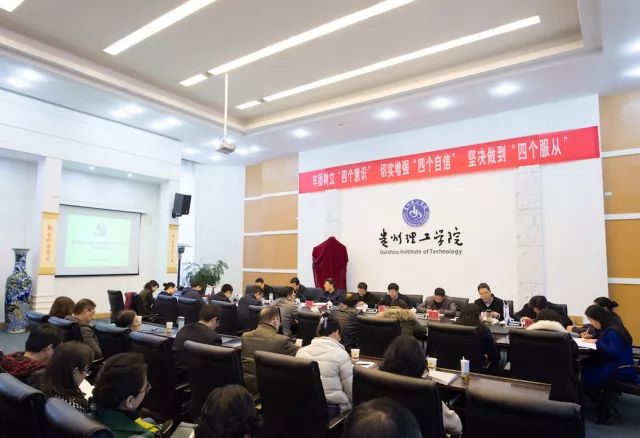本网讯(宣传部 金敏/文 陈智海 邹坤/图)根据中央、省委关于开好2017年度县以上党和国家机关党员领导干部民主生活会的统一安排部署和要求,1月24日上午,在喀斯特会议厅学校党委领导班子召开了以“认真学习领会习近平新时代中国特色社会主义思想,坚定维护以习近平同志为核心的党中央权威和集中统一领导,全面贯彻落实党的十九大各项决策部署”为主题的2017年度民主生活会。省教育厅副厅长级督学、省委教育工委委员何秀黔及省教育厅相关人员到会指导。党员校领导曾羽、龙奋杰、张波、王建平、宋建波、苏向东参加会议,副校长梁杰、部分中层领导干部及教职工代表列席会议。会议由校党委书记曾羽主持。