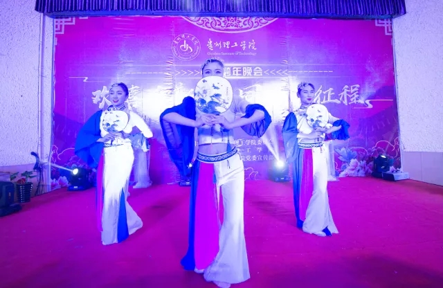 12月28日晚,“欢喜迎新春 ,同心启征程”贵州理工学院迎新年晚会在逸夫小报告厅精彩上演,校领导与广大师生欢聚一堂,一起见证2017年的完美落幕,共同迎接2018年新征程的开启。一曲充满激情的女子民乐演奏瞬间点燃了全场热烈的气氛;悠扬的木叶吹奏出的大自然乐章如涟漪般在空气中声声回荡,绵绵悱恻;苗族姑娘们的歌声喉清韵雅,仿似刚刚酿出的香醇美妙苗家米酒,沁人心脾;神奇的大型近景道具魔术带我们穿越魔幻时空,让观众大为惊叹;惊险刺激的肩上芭蕾一次次挑战极限,台下无不拍手叫好……表演中间穿插的有趣的互动,精心编排的节目不断将晚会推向高潮。