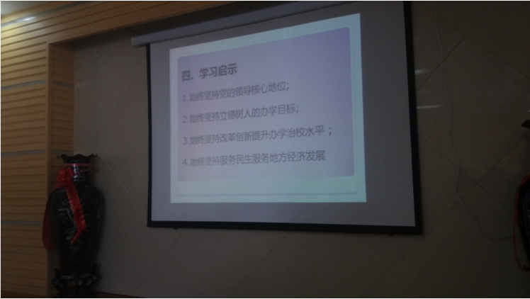 最后,他与全体党员同志分享了他本人“始终坚持党的领导核心地位、始终坚持立德树人的办学目标、始终坚持改革创新提升办学水平、始终坚持服务民生服务地方经济发展”四点学习心得,并对机关第六党支部全体党员干部提出了要进一步思考和研究如何全面贯彻落实习近平总书记关于如何办好中国特色社会主义大学的重要精神,希望全体党员开展理论学习和实践研究,进而推动我校更好更快、有特色的发展。
