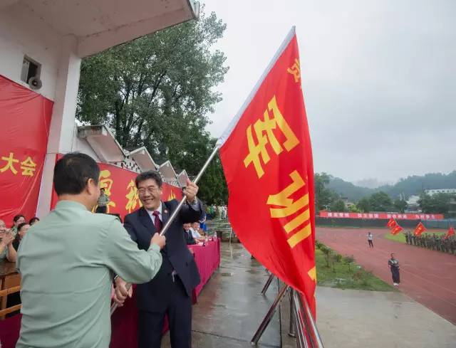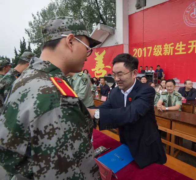校长龙奋杰向副校长、军训团团长梁杰授2017级新生军训团团旗,梁杰向军训团司令部参谋长韩飞授旗。