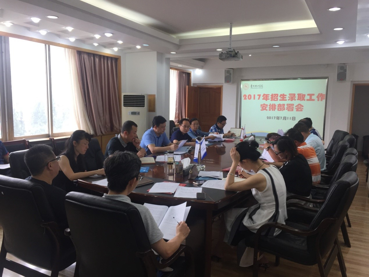 李源传达了《贵州理工学院关于认真做好2017年招生录取工作的安排意见》(贵理工发[2017]101号)文件精神,围绕网络、录取、保卫、后勤、咨询5个方面对招生录取工作进行安排和说明。