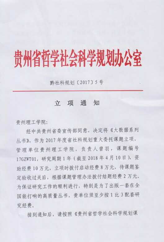 本网讯(宣传部 巫敏) 根据黔社科规划〔2017〕5号文件,经中共贵州省委宣传部同意,我校《大数据系列丛书》,作为2017年度省社科规划重大委托课题立项。