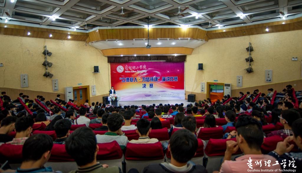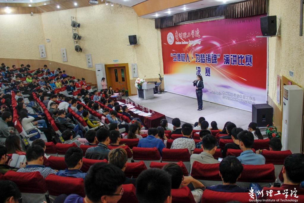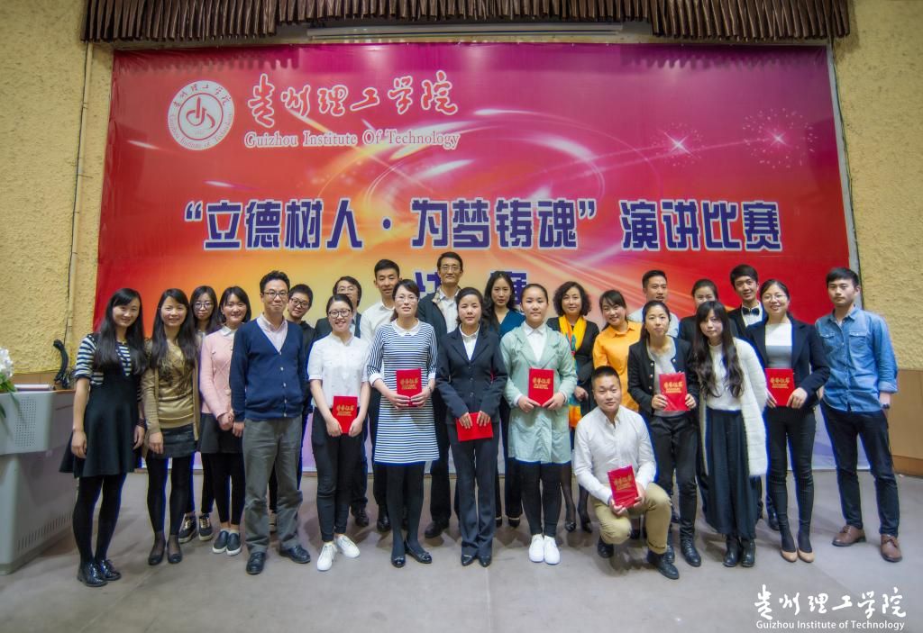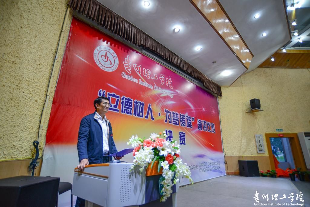 本网讯 4月27日晚,由教师工作处、校团委主办的“立德树人•为梦铸魂”演讲比赛决赛,在逸夫小报告厅举行。校党委副书记宋广强出席,贵州广播电视台综合广播主任播音员、贵州省演讲与口才协会副会长韩洪雷,学工部部长徐元敏,人事处处长高勇,工会副主席熊远兴,大外部党总支副书记袁小松担任比赛评委。