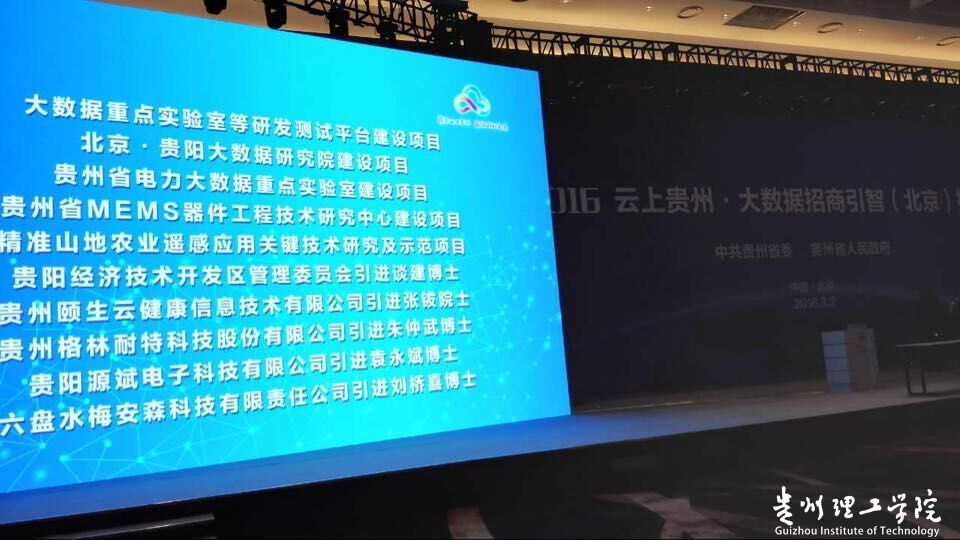 本网讯(宣传部 巫敏) 为充分展示贵州大数据产业发展良好态势,提升“云上贵州”品牌影响力,3月2日,2016云上贵州·大数据招商引智(北京)推介会在北京国家会议中心举 行。校长龙奋杰作为代表出席推介会并与清华大学和上海交通大学现场签署“贵州省电力大数据重点实验室”合作共建协议。