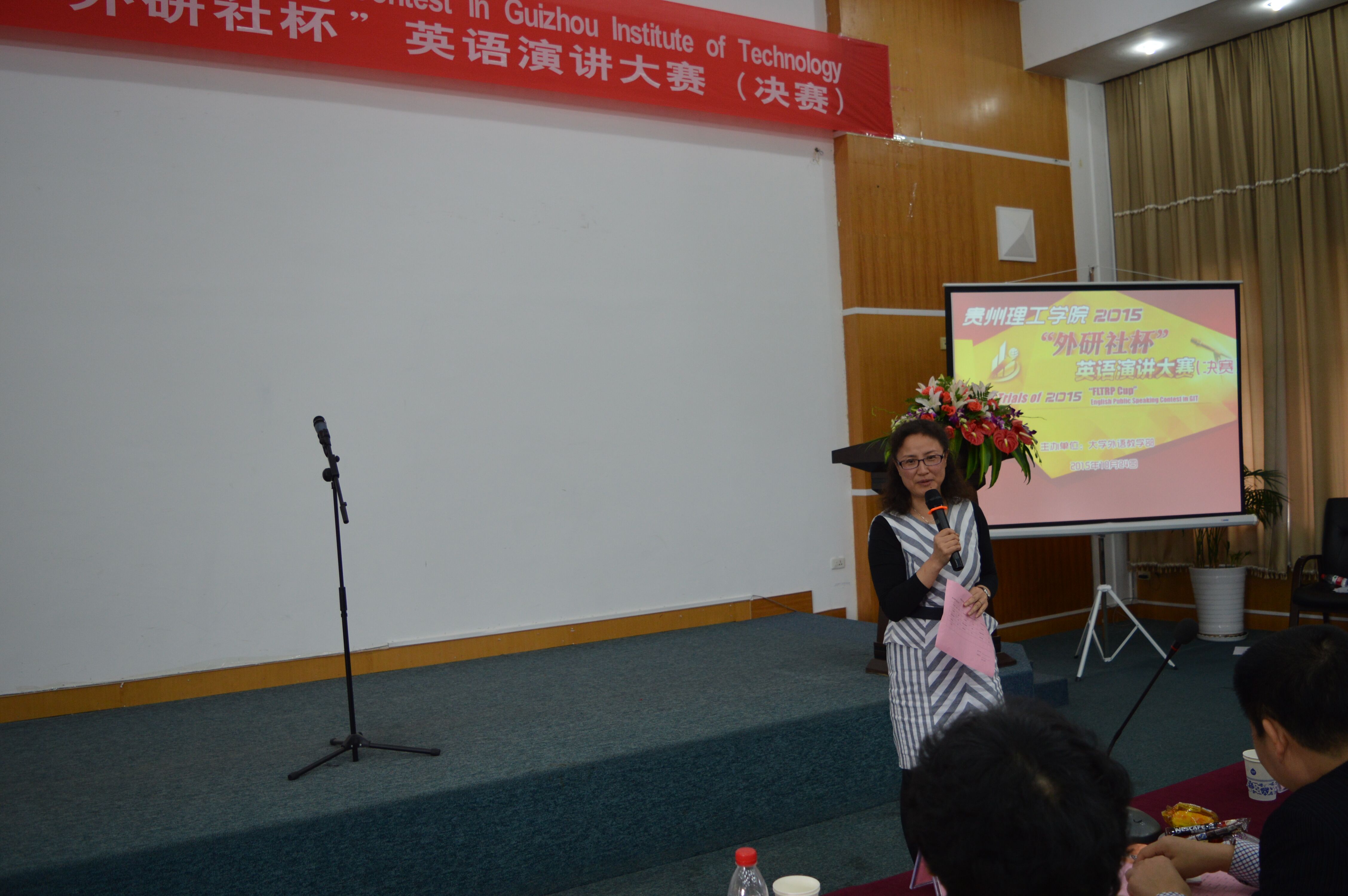 本网讯(大外部 冯建平) 10月24日上午,贵州理工学院2015年“外研社杯”英语演讲大赛在喀斯特报告厅举行。贵州大学外国语学院副院长洪云教授、贵州民族大学外国语学院院长肖唐金教授、贵阳学院外国语学院院长孟俊一教授以及我校大外部副主任周丽副教授、外教Adam担任比赛评委。演讲比赛决赛遵照全国“外研社杯”英语演讲大赛的规则,分为定题演讲、现场回答问题和即兴演讲三个环节。