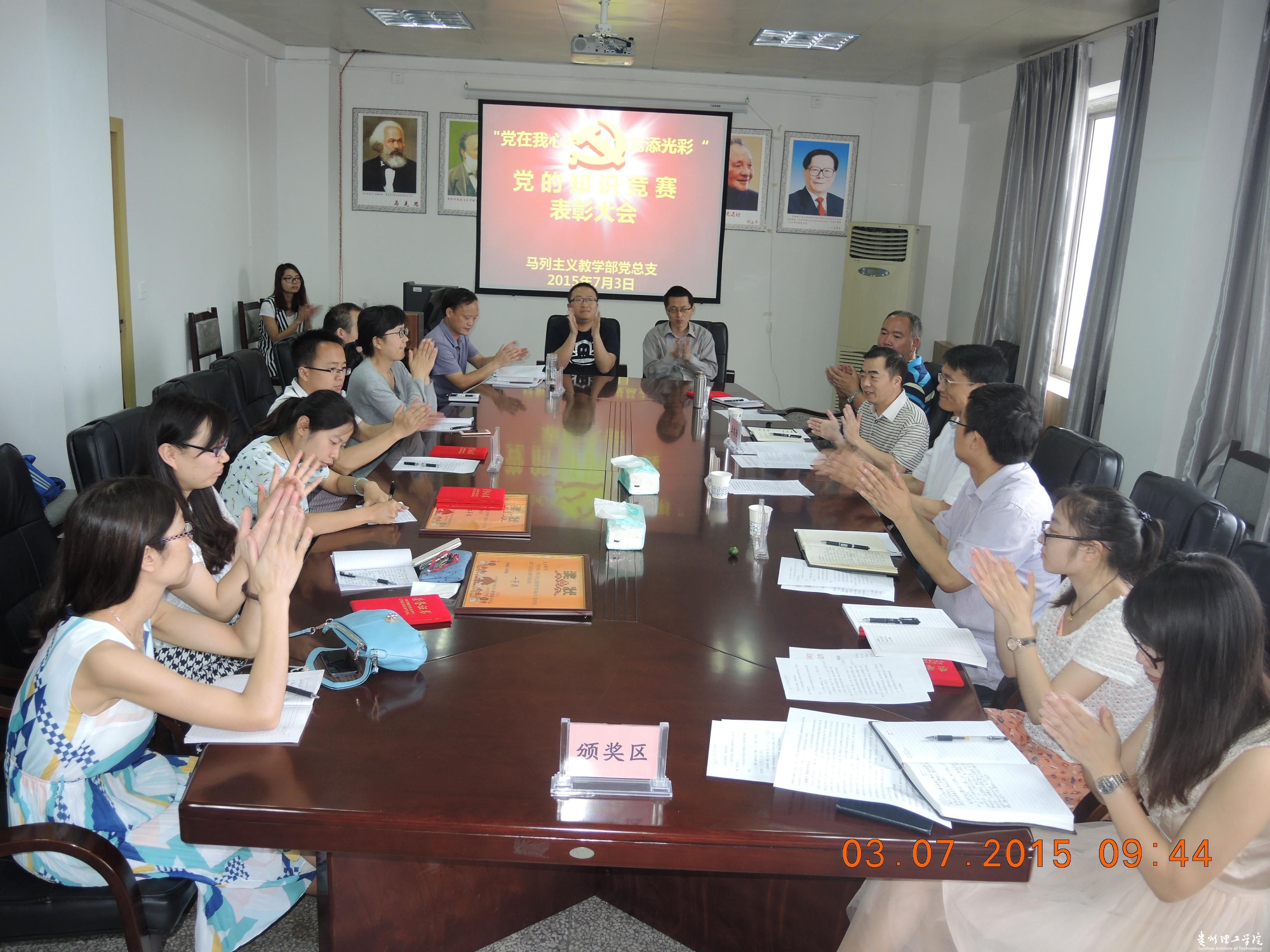 本网讯(马列主义教学部 蓝文思 张建军) 7月3日上午,马列主义教学部党总支召开“党在我心中,我为党添光彩”党的知识竞赛表彰大会。校党委副书记宋广强出席会议。会议由马列部党总支副书记王忠奎主持。