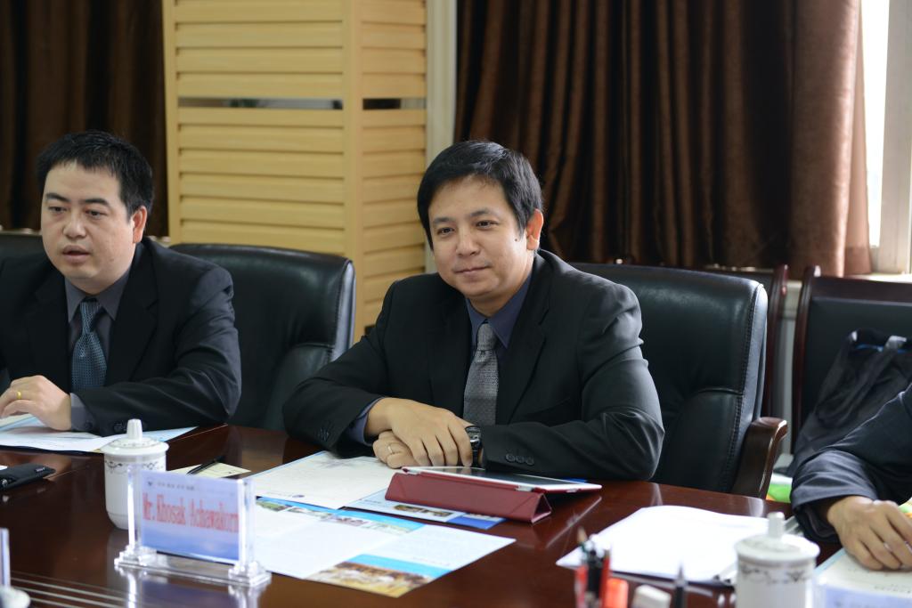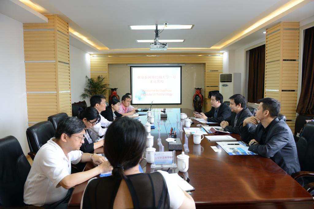 宋广强向客人一行介绍了我校办学条件、学科建设、招生工作、教学管理等情况。Mr. Khosak Achawakron介绍了斯巴顿大学概况并播放宣传短片。双方围绕科研合作、学生交流、教师派出、进修、学历提升等方面进行了讨论并达成初步共识。