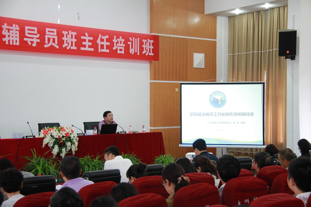 开班典礼结束后,校党委书记曾羽为培训班开讲第一课,作《贵州理工学院思想政治教育工作的新形势和新任务》主题报告。他从思想政治工作的基本概念;大学教育的新形势和新特点;辅导员、班主任的职业特点、职业素质、职业能力、职业道德;国外德育教育的新变化;思想政治工作的新任务等五个方面,就如何做好新形势下的大学生思想政治教育工作进行了深入浅出的阐述,强调要教会学生“理性思考”,要用中华民族的人文精神教育大学生。他对贵州理工学院的辅导员、班主任们提出要求:做大学生的人生导师,做大学生的衣食父母;把学校的建设发展、校园的安全稳定、学生的成长成才系于一身。