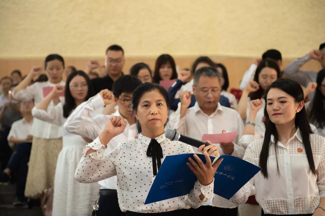 “我是一名光荣的人民教师,我庄严宣誓,忠诚党的教育事业,贯彻党的教育方针,履行教师神圣职责……为全体学生美好未来,我愿奉献全部智慧和力量!”新入职教师在老教师王琳带领下,在全体参会人员的见证下庄严承诺。