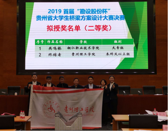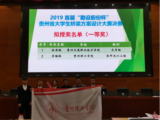 本网讯(交通工程学院 王轶多)2019年11月3日,2019 首届“勘设股份杯”贵州省大学生桥梁方案设计大赛决赛在贵州省交通规划勘察设计研究院股份有限公司举行。由贵州理工学院交通工程学院杨光强、张文利老师指导,学生王轶多、郑敏、王超、陈桥、徐茂飞共同设计完成的作品《寻梅桥》荣获一等奖,由娄锋、张文利老师指导,学生黄娇、余胜忠、邹川、陆玉雪、王兵兵共同设计完成的作品《终结者》荣获二等奖。