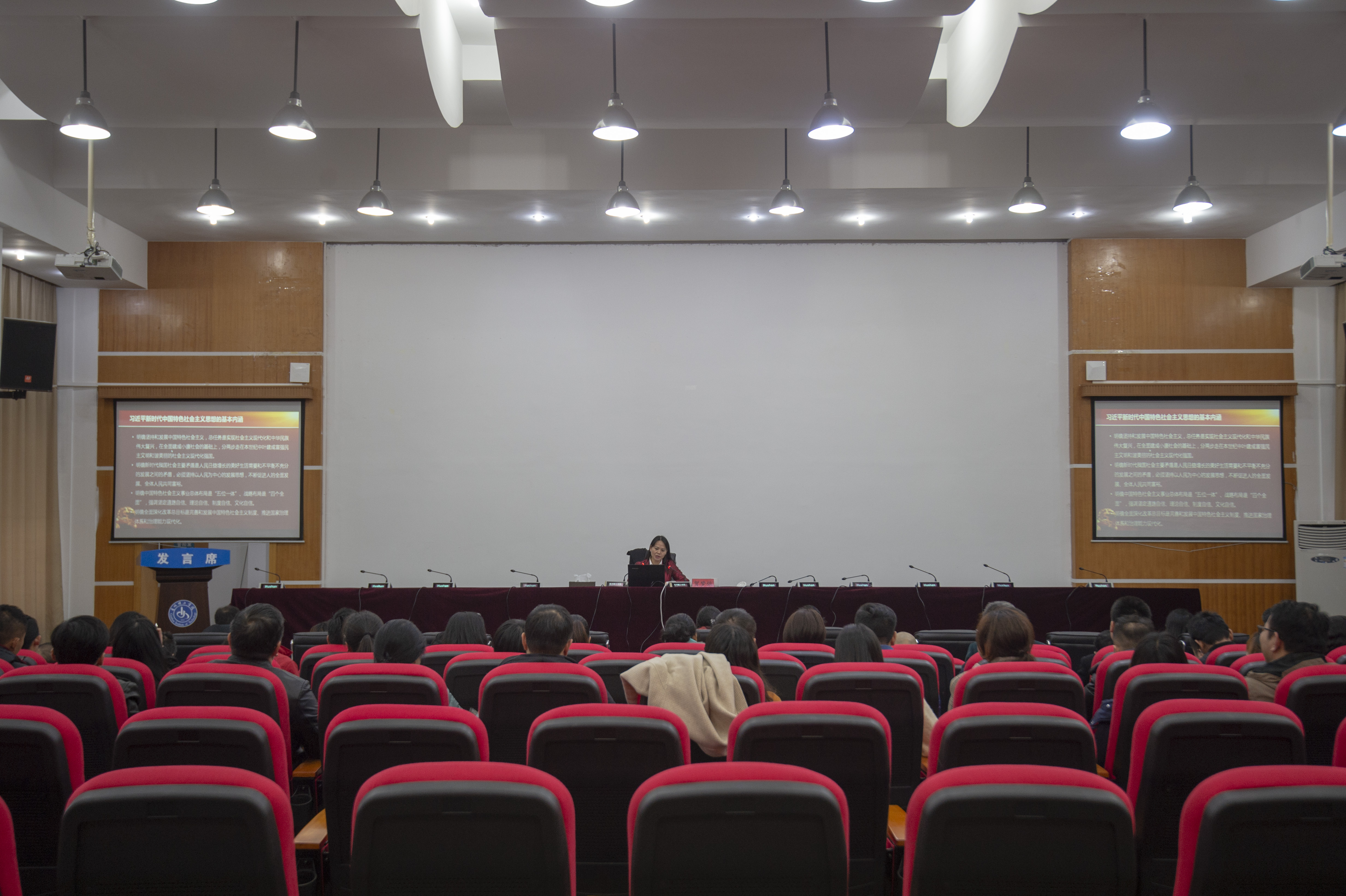 本网讯(主题教育办 夏雍)根据学校主题教育工作安排,2019年11月22日下午,党委委员、纪委书记、贵州省监察委员会驻贵州理工学院监察专员贺梦依,在喀斯特报告厅作题为“用习近平新时代中国特色社会主义思想武装头脑,做好新时期纪检监察工作”的专题党课。学校各基层党委(党总支)主要负责人、纪检委员,各基层党支部书记、纪检委员聆听了党课。