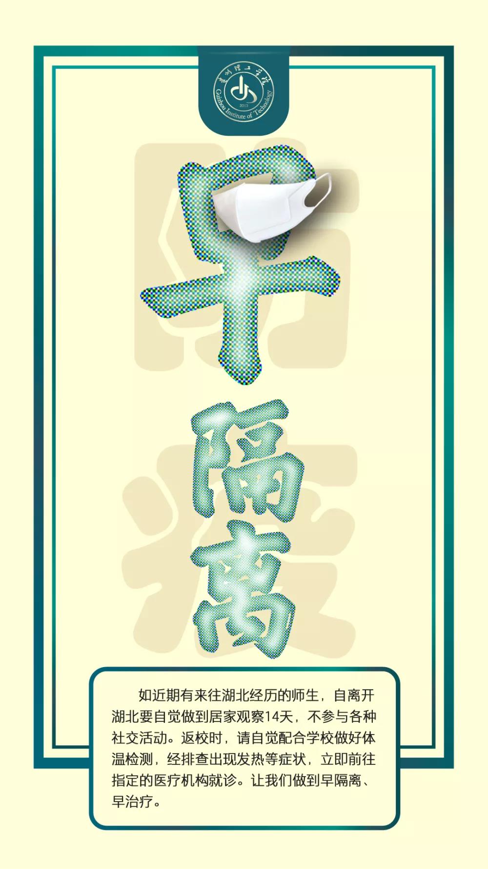 设计说明:在这突如其来的疫情中,全国人民都在奋战抵抗病毒,面对病毒我们需要做到四个”早”,早发现、早报告、早隔离、早治疗,做到这四个”早”,保护自己,也保护他人。作品整体色彩为明亮温馨的浅黄色和绿色,”防疫”作为背景,利用相关性图形替代文字中“早”字的一笔,突出早的重要性及意义,作品下方为防疫措施,作品整体以科普宣传为主,向人们宣传如何做好防疫战,愿早日击退病毒。
