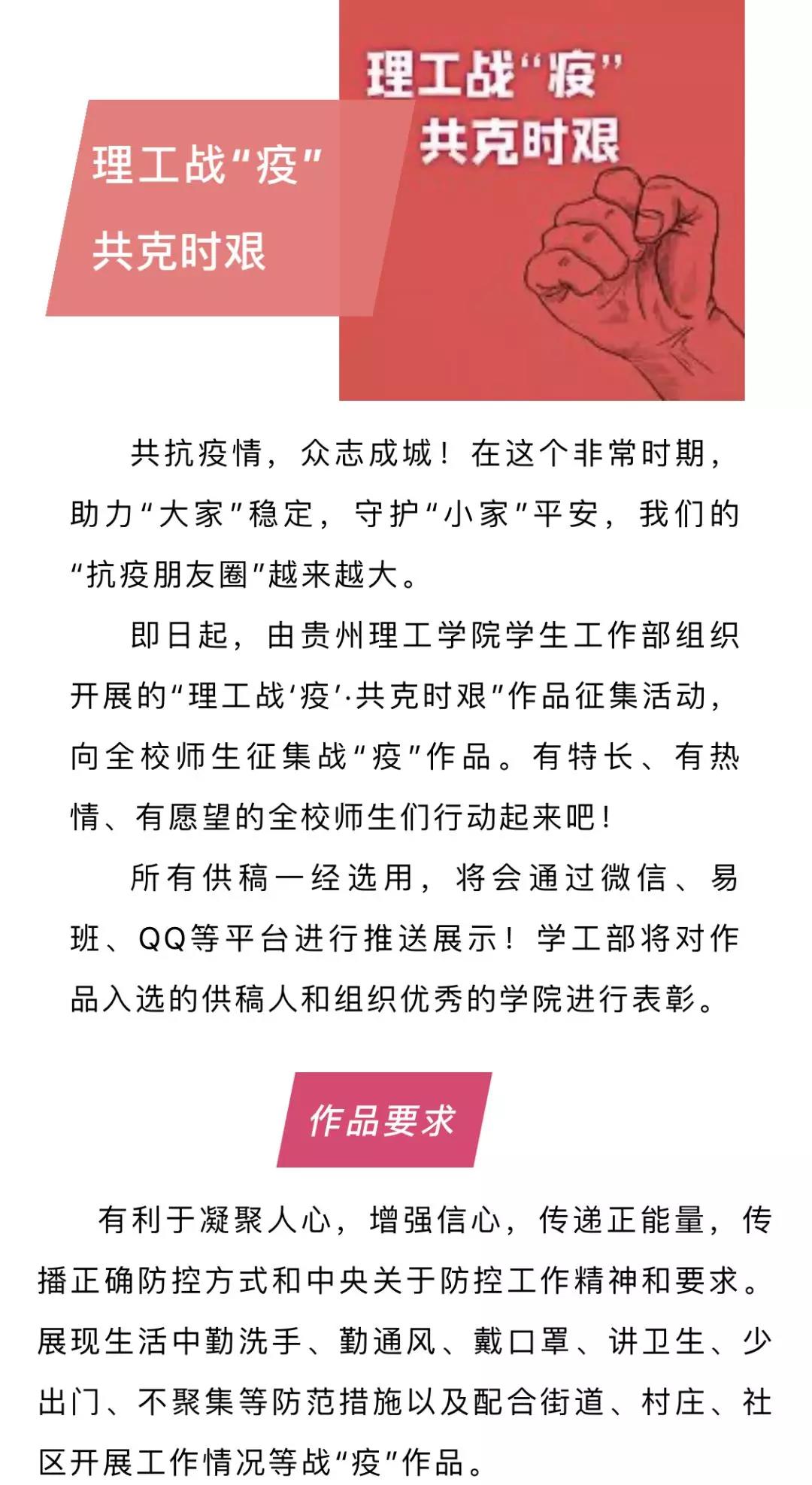 发布《致全体学生及家长的一封信》;开展“理工战‘疫’‧共克时艰”作品征集活动;开通心理危机干预微信平台、QQ群,开展线上心理辅导及心理危机干预工作;制定校内专项资助方案,对因疫情导致家庭经济困难的学生予以及时资助。面对疫情、面对广大师生安全与学校安全稳定,学工战线一直在努力,用我们的方式传递爱、传递信心、传递力量!