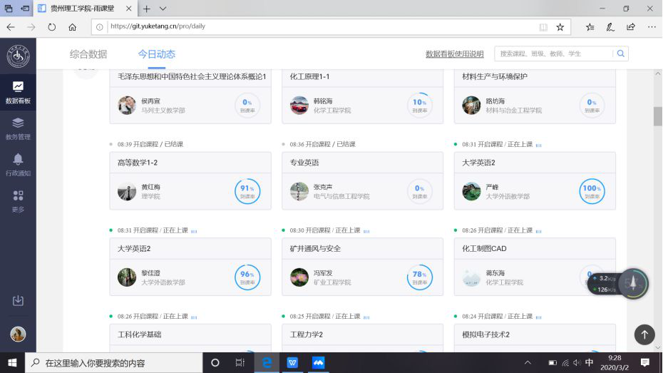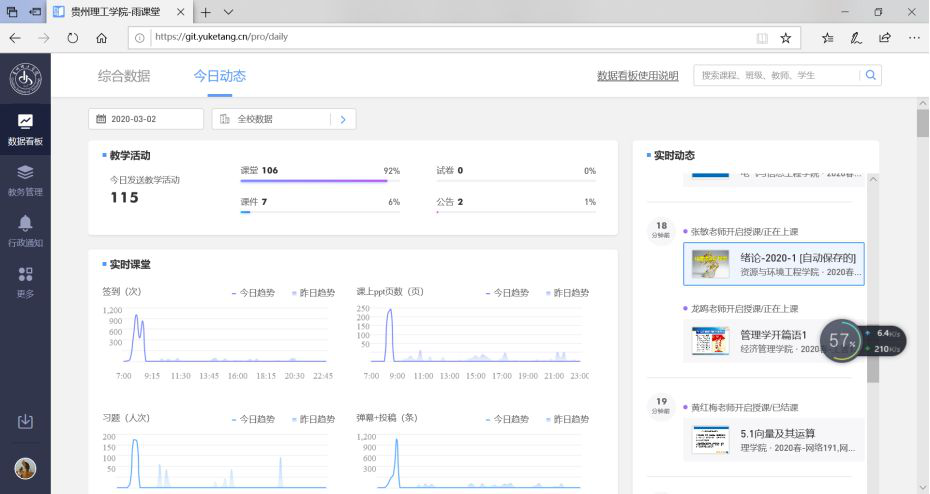 据统计,3月2日共有159门课程开展了线上授课,授课教师达266人,共220个班级通过雨课堂、QQ直播、腾讯会议、钉钉等软件和平台进行线上学习。