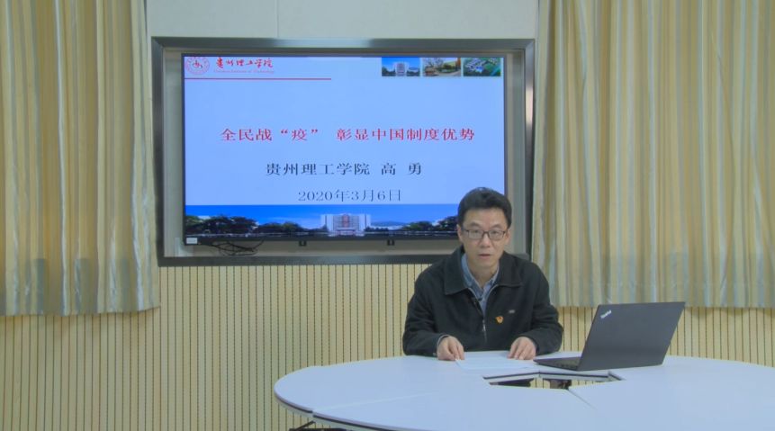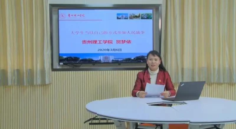 党委委员、纪委书记、省监委驻贵州理工学院监察专员贺梦依以《大学生当以自己的方式参与人民战争》带领同学们回顾了“浙大西迁”及“西南联大成立”这两件中国高等教育的历史大事件,引导大家从中领会爱国主义为核心的民族精神、追求真理的求是精神和刚毅坚卓的艰苦奋斗精神。并深情地寄语同学们要有自己的精神故乡,在打赢疫情防控这场人民战争中继续秉承爱国主义精神和艰苦奋斗的精神;要认真学习专业知识、党史国史、哲学经典和伦理经典,实现人生价值,成就美好时代。