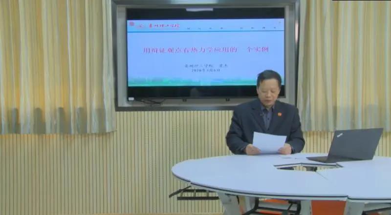 副校长梁杰以《用辩证观点看热力学应用的一个实例》为题与同学们进行交流。他从习近平总书记的“扣子论”开始引入课程,并通过回顾唯物辩证法知识和热力学知识,运用唯物辩证法详细论证了“热寂论”只是一个虚妄的学说,是不可能实现的一种状态,从而引导同学们要树立正确的世界观、人生观、价值观,通过学习好、掌握好、运用好马克思主义的立场、观点和方法更好地认识自然、认识世界,更好地为人类服务。
