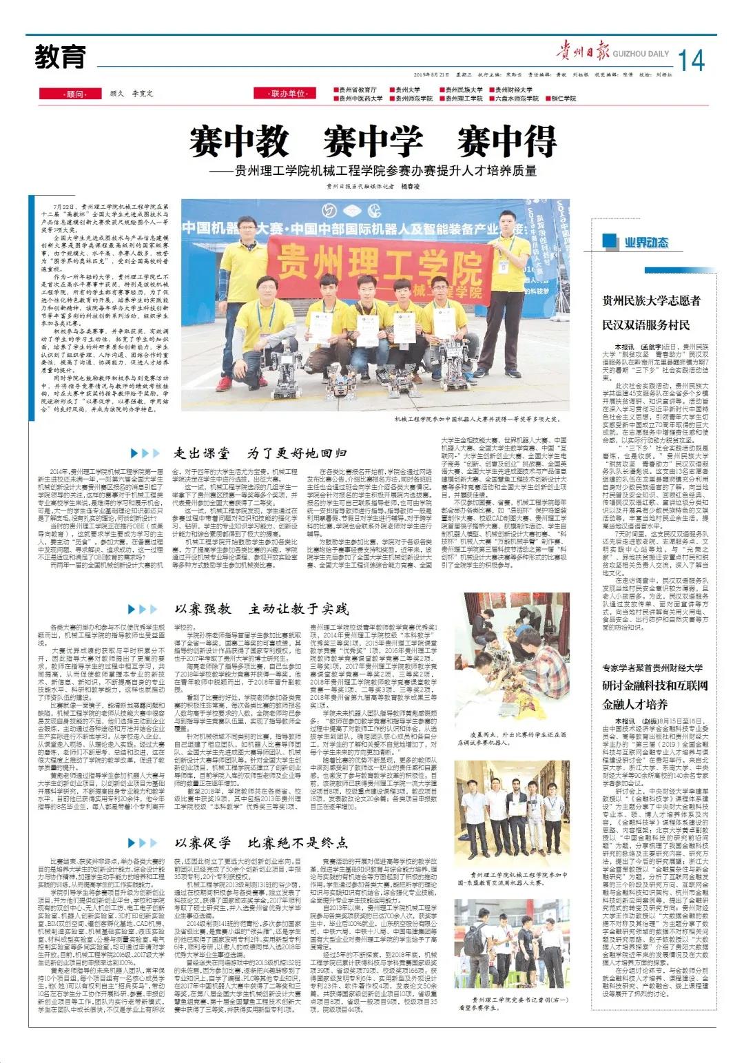 2019年8月21日,贵州日报对机械工程学院参赛办赛提升人才培养质量进行了整版报道
