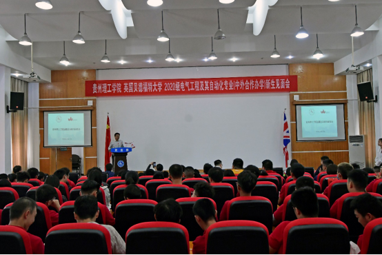 本网讯(国际教育学院 欧阳宇娟/文)枫叶飘红,寒菊浮香。10月12日下午,贵州理工学院与英国贝德福特大学合作举办的电气工程及其自动化专业本科教育项目2020级新生见面会在蔡家关校区喀斯特报告厅成功举行。校领导胡兴灿,英国贝德福特大学中国办公室主任Colin WANG一行以及学校相关职能部门负责人,中外合作班辅导员、班主任,中外合作班全体新生、高年级学生代表参加了开班典礼。