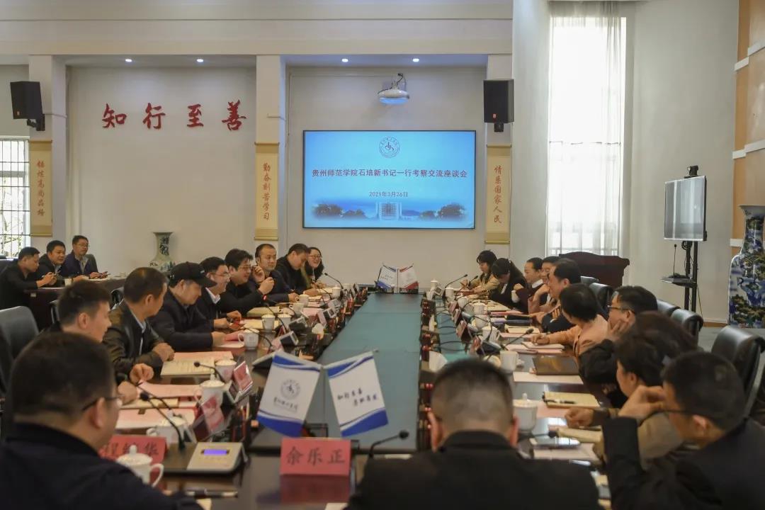 本网讯(党委办公室 邓毓政/文)2021年3月26日下午,贵州师范学院党委书记石培新、校长韦维一行16人赴我校考察交流。交流座谈会在喀斯特会议厅举行,贵州师范学院领导石培新、韦维、郭文、肖振猛、杨昌顺、张婷,贵州理工学院领导曾羽,苏向东、吴次南、林长松、左柏州、李朋出席座谈会。会议由贵州理工学院校长苏向东主持。