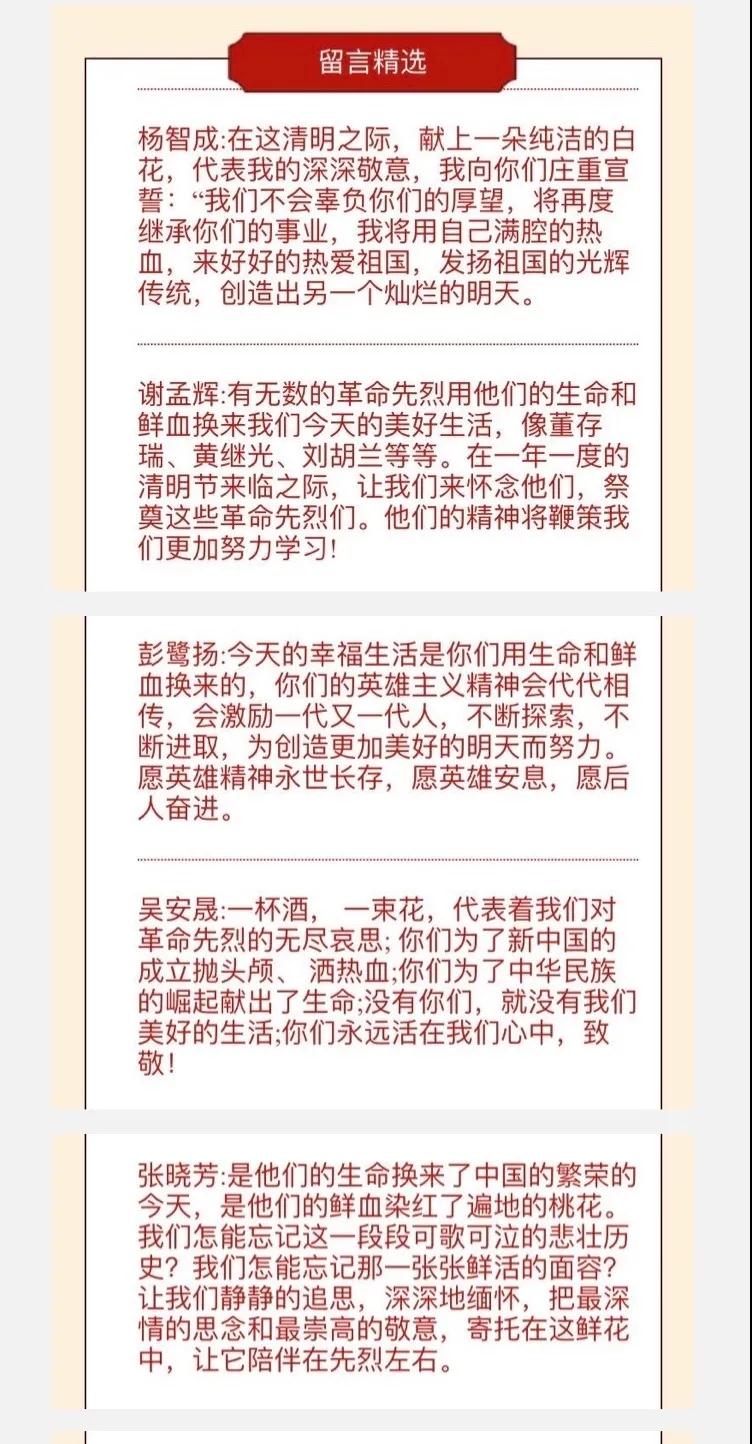“我们不会辜负你们的期望,将继承你们的事业,用满腔热血创造出另一个灿烂的明天”“无数的革命先烈用他们的生命和鲜血换来我们今天美好的生活,我们怀念他们!他们的精神将鞭策我们更加努力学习!”一段段网上留言,寄托着同学们的哀思与敬仰,表达了自己会珍惜现在美好生活和勤奋学习的愿望。