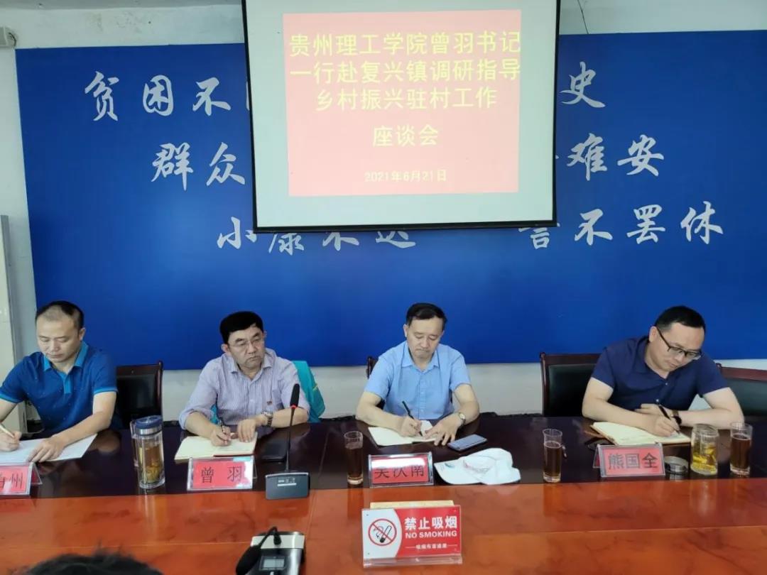 本网讯(苏姝/文图)6月21日,校党委书记曾羽、党委副书记吴次南一行赴湄潭县复兴镇调研指导乡村振兴驻村工作,集中看望了我校驻湄潭县乡村振兴驻村第一书记(驻村干部),并与复兴镇领导、驻村干部举行了座谈。