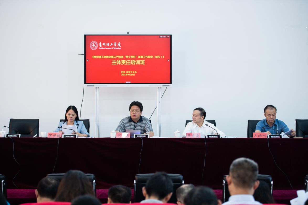 本网讯(纪委 绪言)9月29日,贵州理工学院全面从严治党“两个责任”备案工作主体责任培训班在蔡家关校区喀斯特报告厅开班。党委副书记、院长苏向东出席开班式并讲话,党委委员、纪委书记、监察专员贺梦依,党委委员、党委组织部部长左柏州出席开班式,党委副书记(正厅长级)吴次南主持开班式。机关党委、各党总支书记和纪检委员,机关党委下设党支部书记和纪检委员,纪委监察专员办内设机构、党委巡察工作办公室全体人员共70人参训。