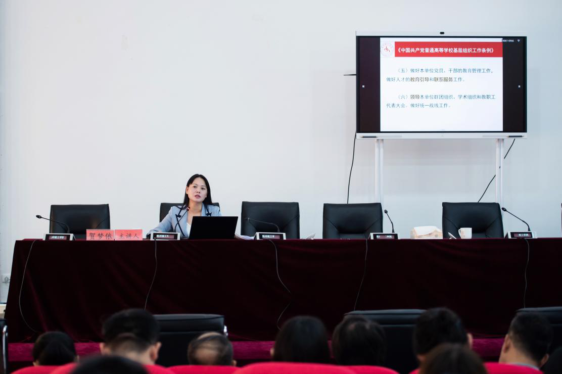 开班式后,党委委员、纪委书记、监察专员贺梦依从推动学校党建高质量发展的角度,对《中国共产党普通高等学校基层组织工作条例》《党委(党组)落实全面从严治党主体责任规定》《中共中央关于加强对“一把手”和领导班子监督的意见》《中共中央关于加强党的政治建设的意见》《关于加强高校党的政治建设的若干措施》等中央有关制度规定中,涉及主体责任的方面进行了深入学习解读。