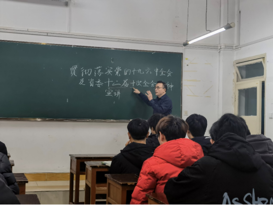 张开智从中国共产党的组织架构讲起,以历史时间为节点,结合十九届六中全会的主要内容,为同学们讲述了主要历史节点发生的重要事件及历史意义,帮助同学们梳理清楚党的历史进程,并宣讲了十九届六中全会及省委十二届十次全会的精神及主旨要义,结合生动实例宣讲了“两个确立”的政治意义、理论意义、世界意义。他号召同学们,作为新时代的青年,要以全会形成的《决议》精神和省委十二届十次全会精神为指引,统一我们的思想和行动,在为贵州围绕“四新”主攻“四化”、贵州新型工业化和强省会战略中做出自己应有的贡献。宣讲的最后他对同学们提出“十九届六中全会精神的意义”的思考题,要求同学们写下心得体会。