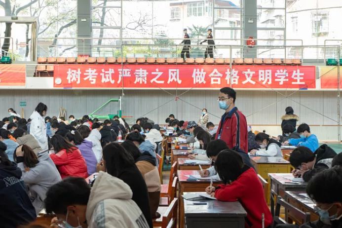 疫情防控常态化下的当下,为了这次“千人同场考试”,学校相关职能部门付出了辛勤劳动,保卫处为学生专设考试通道,后勤处对体育馆进行消杀并对学生进行体温检测,教务处搬运桌椅并布置考场,各二级学院培训监考老师。据悉,这样的“千人同场考试”以后每学期将常态化举行。