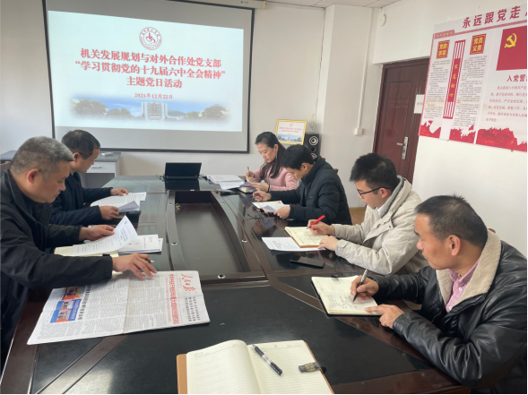 本网讯(发展规划与对外合作处 覃引)2021年12月22日,副校长林长松在行政楼328会议室为机关发展规划与对外合作处党支部全体党员及入党积极分子宣讲党的十九届六中全会及省委十二届十次全会精神。
