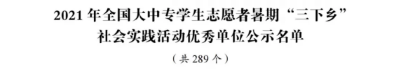 为总结经验、做好典型宣传、激励广泛参与、发挥育人实效。近日,共青团中央青年发展部对在2021年度社会实践活动中表现突出的集体、个人和项目进行表彰。我校团委荣获“2021年全国大中专学生志愿者暑期‘三下乡’社会实践活动优秀单位”称号!