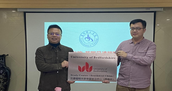 胡兴灿对Colin Wang一行的到来表示欢迎,肯定了两校合作4年以来取得的成果,也指出了丞待解决的阻碍项目优质发展的相关问题,希望两校之间能够加强沟通,进一步引进优质资源,让学生有获得感,提高师生满意度。双方就项目协议续签、项目合格评估工作等问题进行了深入商讨,并达成了初步意向。最后,ColinWang代表英国贝德福特大学授牌,标志着我校正式成为英国贝德福德大学中国学习中心(西南区)。