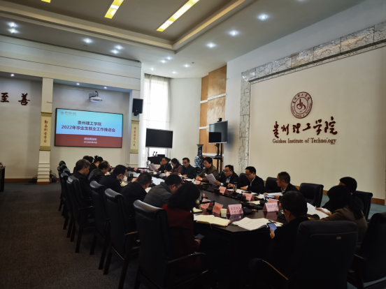 本网讯( 招生就业处 崔美娟) 3月23日下午,贵州理工学院2022年毕业生就业工作推进会在喀斯特会议厅召开。校党委书记苏向东,党委副书记、校长潘良明,副校长张开智出席会议,会议由张开智主持。
