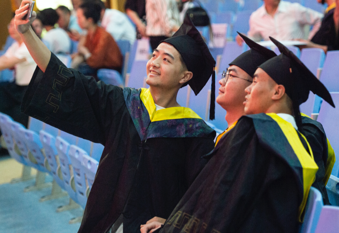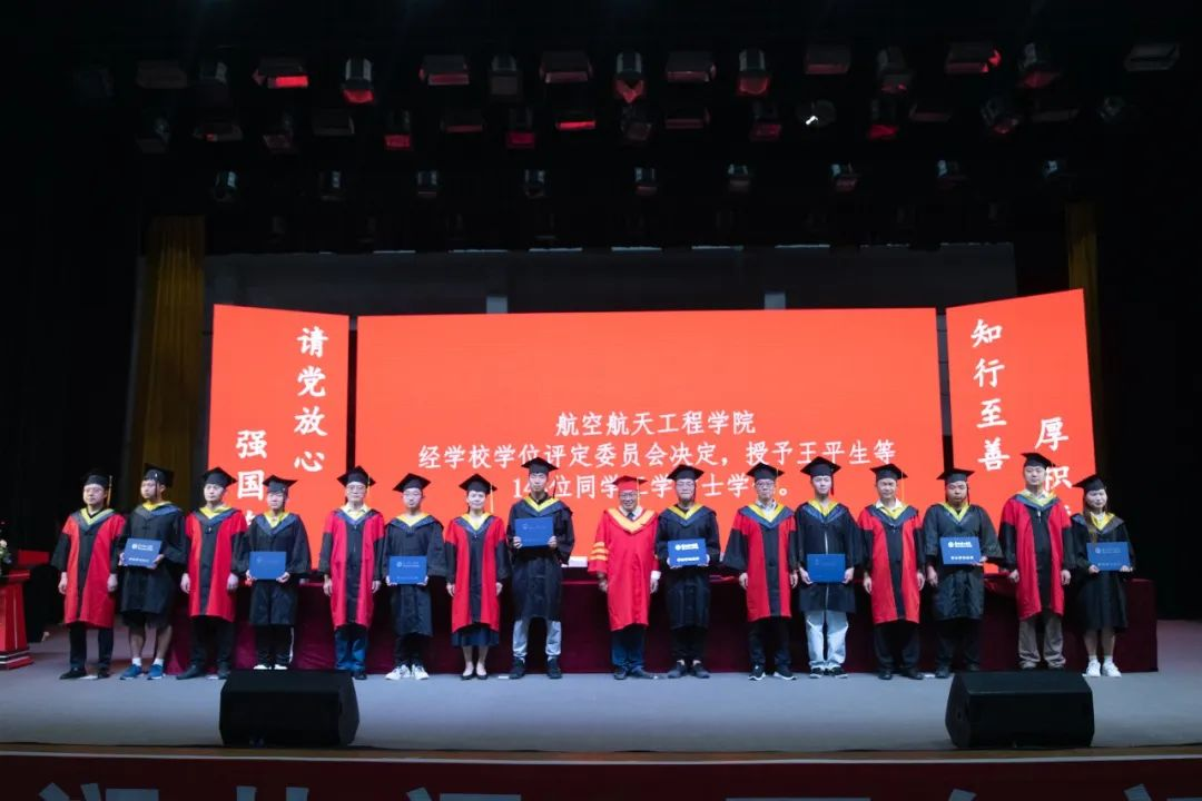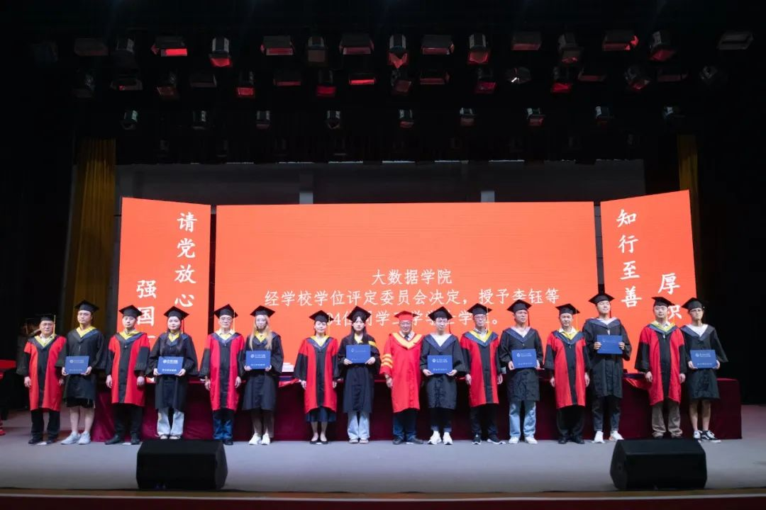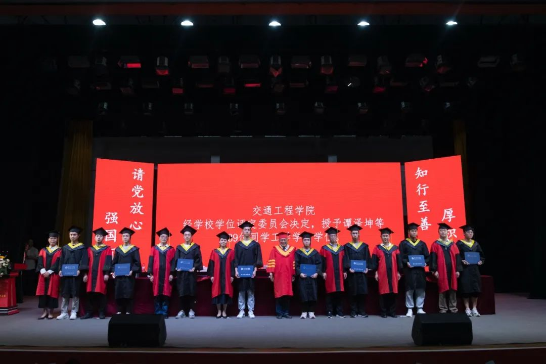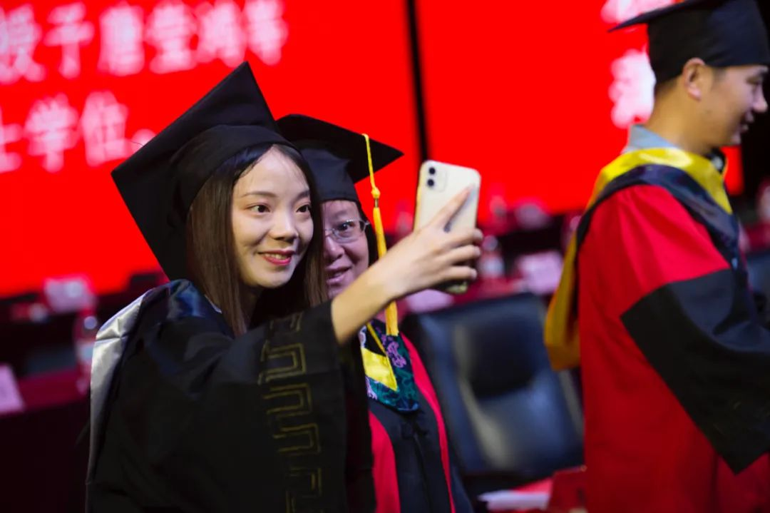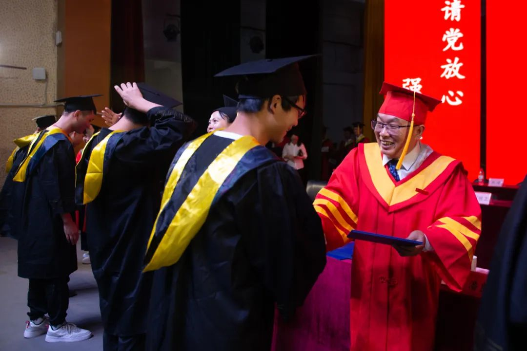 毕业典礼结束后,举行了学位授予仪式,校领导、校学位评定委员会委员为学士学位的毕业生代表拨穗、颁发学位证书并合影留念。