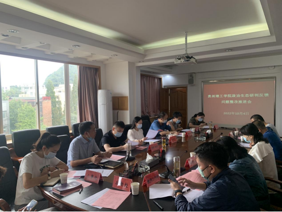 本网讯 2022年10月4日上午,学校在蔡家关校区综合楼五楼会议室召开贵州理工学院政治生态研判反馈问题整改推进会。校党委委员、纪委书记、监察专员贺梦依,党委委员左柏州、李朋出席会议。会议由党政办公室副主任、巡察办副主任邓毓政主持。