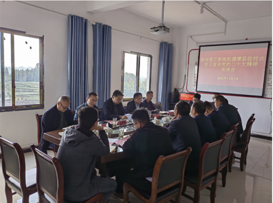 11月1日,校党委书记苏向东,党委副书记、校长潘良明,党委委员、副校长、乡村振兴专班班长张开智率队赴我校湄潭县驻村点调研乡村振兴工作,看望驻村干部和了解工作情况。苏向东在湄潭县复兴镇观音阁村村委会会议室,组织学校驻村干部和有关人员主持召开了学习宣讲党的二十大精神座谈会,传达学习党的二十大精神和习近平总书记在陕西延安和河南安阳考察时的重要讲话精神,听取5名驻村干部学习党的二十大精神心得体会和驻村工作汇报,调研学校助力观音阁村产业振兴试点合作意向的相关事宜。