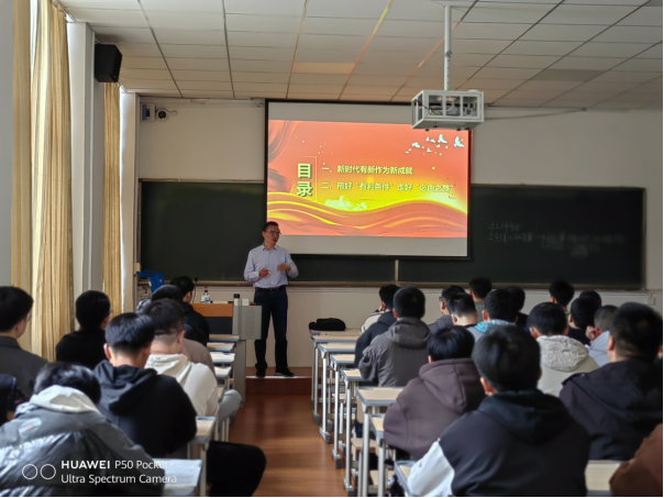 本网讯(马克思主义学院 孙雯)11月14日下午,副校长张开智以“伟大时代的历史跨越”为题,在蔡家关校区第二教学楼2213教室为学校矿业工程学院大四学子讲授了一堂生动、精彩的专题思政课。
