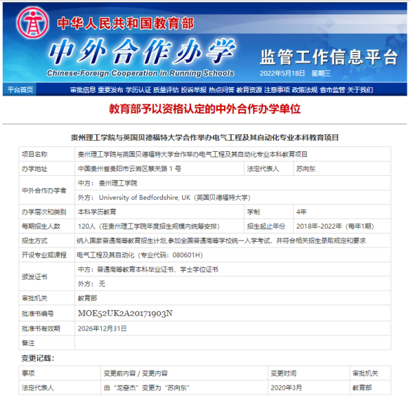 升级“3+1”模式,即学生达到学业与外语要求,可通过两校学生校际交流的方式,在大四期间赴英国贝德福特大学交流学习一年。在英国攻读大四的一年时间内,所修课程达到贵州理工学院学生交流学习的学分互认要求,并通过贝大学习考核后,将给学生同时颁发英国贝德福特大学学位证书以及贵州理工学院毕业证书和学位证书。